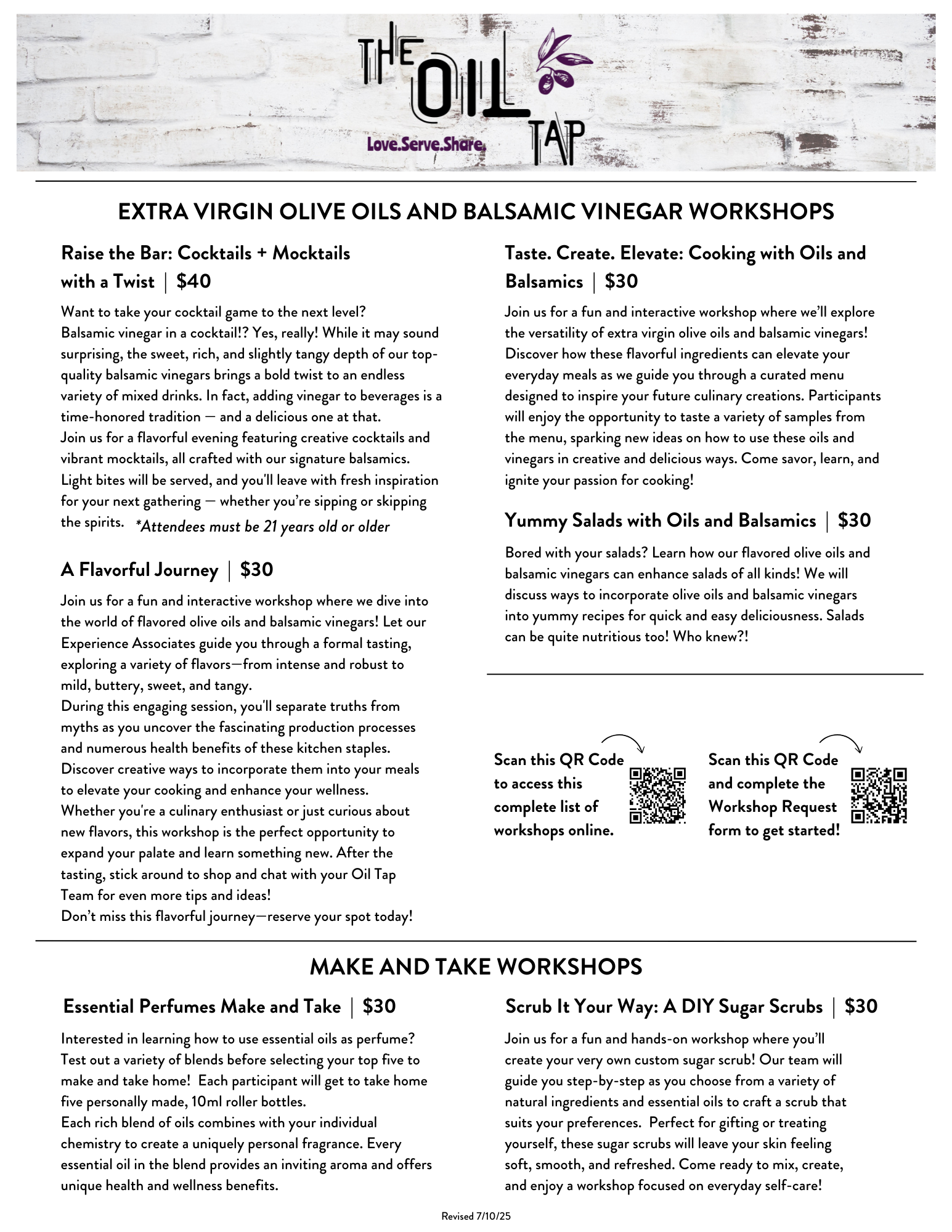 Join us for a fun and interactive workshop where we’ll explore the versatility of extra virgin olive oils and balsamic vinegars! Discover how these flavorful ingredients can elevate your everyday meals as we guide you through a curated menu designed to inspire your future culinary creations. Participants will enjoy the opportunity to taste a variety of samples from the menu, sparking new ideas on how to use these oils and vinegars in creative and delicious ways. Come savor, learn, and ignite your passion for cooking!